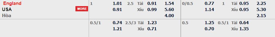 • Mức kèo nhà cái cược chấp trận này: Anh chấp 1 trái. Anh ăn 1,01. Mỹ ăn 0,91