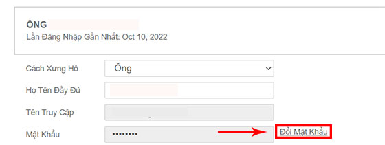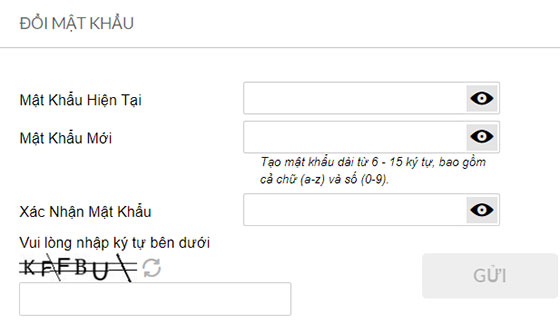 Bảng đổi mật khẩu được hiển thị, với những thông tin như: