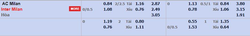 - Mức kèo nhà cái cược chấp trận này: Inter Milan chấp 0,25 Trái. AC Milan ăn 0,84. Inter Milan ăn 1,08