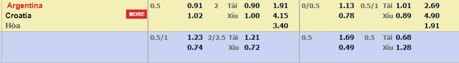 Tỷ lệ châu Á đưa ra mức kèo nghiêng về Argentina nhưng họ chỉ chấp Croatia nửa trái. Điều này cho thấy đây sẽ tiếp tục là 1 trận bán kết rất căng thẳng. Argentina đã thua kèo cả 3 trận đối đầu gần đây trước Croatia. Ngoài ra, Argentina thua kèo 2 trận đấu mới đây tại World Cup.