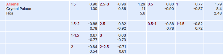 - Mức kèo nhà cái cược chấp trận này: Arsenal chấp 1,5 Trái. Arsenal ăn 0,90. Crystal Palace ăn 1,00