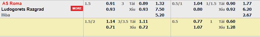 - Mức kèo nhà cái cược chấp trận này: AS Roma chấp 1,5 trái. AS Roma ăn 0,91. Ludogorets ăn 0,93