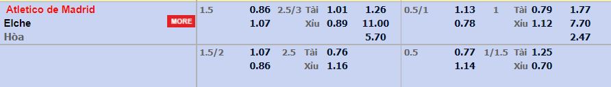 - Mức kèo nhà cái cược chấp trận này: Atl Madrid chấp 1,5 Trái. Atl Madrid ăn 0,86. Elche ăn 1,07