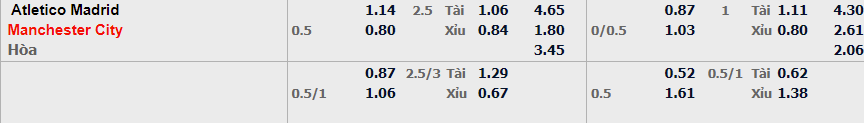 - Mức kèo nhà cái cược chấp trận này: Manchester City chấp 0,5 Trái. Atl Madrid ăn 1,14. Manchester City ăn 0,80