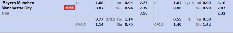 - Mức kèo nhà cái cược chấp trận này: Hòa – Được – Thua. Bayern Munich ăn 1,08. Manchester City ăn 0,82