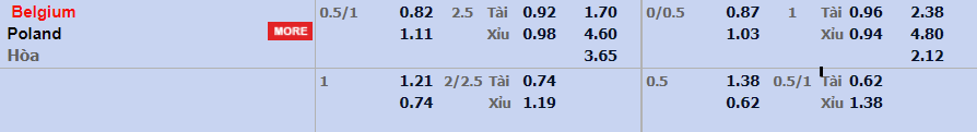 - Mức kèo nhà cái cược chấp trận này: Bỉ chấp 0,75 Trái. Bỉ ăn 0,82. Ba Lan ăn 1,11