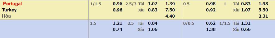 - Mức kèo nhà cái cược chấp trận này: Bồ Đào Nha chấp 1,25 Trái. Bồ Đào Nha ăn 0,96. Thổ Nhĩ Kỳ ăn 0,96
