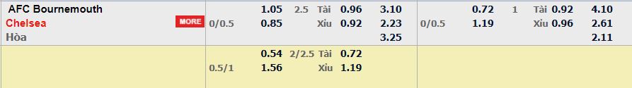 - Mức kèo nhà cái cược chấp trận này: Chelsea chấp 0,25 trái. Bournemouth ăn 1,05. Chelsea ăn 0,85