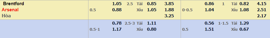 - Mức kèo nhà cái đưa ra trận này: Arsenal chấp 0,5 Trái. Brentford ăn 1,05. Arsenal ăn 0,88