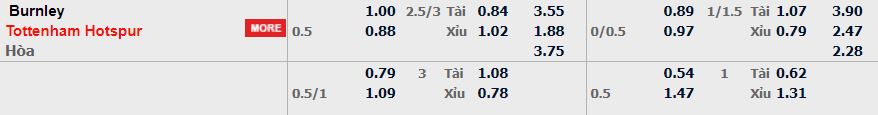 - Mức kèo nhà cái cược chấp trận này: Tottenham chấp 0,5 Trái. Burnley ăn 1,00. Tottenham ăn 0,88