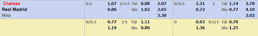 - Mức kèo nhà cái cược chấp trận này: Chelsea chấp 0,5 Trái. Chelsea ăn 1,07. Real Madrid ăn 0,86