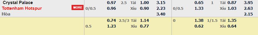- Mức kèo nhà cái cược chấp trận này: Tottenham chấp 0,25 Trái. Crystal Palace ăn 0,97. Tottenham ăn 0,96