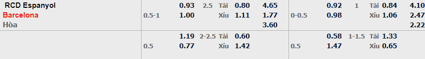 - Mức kèo nhà cái cược chấp trận này: Barcelona chấp 0,75 Trái. Espanyol ăn 0,93. Barcelona ăn 1,00