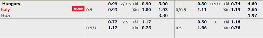 - Mức kèo nhà cái cược chấp trận này: Italy chấp 0,5 Trái. Hungary ăn 0,99. Italy ăn 0,93