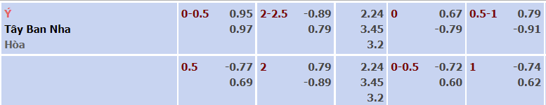 - Mức kèo nhà cái cược chấp trận này: Italy chấp 0,25 Trái. Italy ăn 0,95. Tây Ban Nha ăn 0,97
