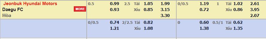 - Mức kèo nhà cái cược chấp trận này: Jeonbuk chấp 0,5 Trái. Jeonbuk ăn 0,99. Daegu ăn 0,93