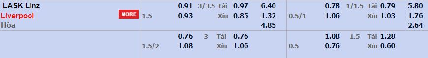 - Mức kèo nhà cái cược chấp trận này: Liverpool chấp 1,5 Trái. LASK ăn 0,91. Liverpool ăn 0,93