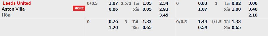 Leeds trong mùa giải trước vật lộn với vị trí trụ hạng đã thua Aston Villa ở cả 2 lượt trận, điều này có thể sẽ được cải thiện hơn một chút ở thời điểm này bởi phong độ của đôi bên vào lúc này là không có quá nhiều sự khác biệt. Với những lý do đó, kèo châu Á ghi nhận 2 đội ở mức đồng banh và không có tỷ lệ chấp và cũng có nơi cho rằng Leeds sẽ là cửa trên chấp 0.25 nhờ lợi thế sân nhà.
