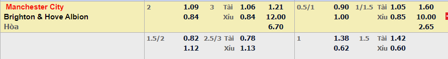 - Mức kèo nhà cái cược chấp trận này: Manchester City chấp 2 Trái. Manchester City ăn 1,09. Brigton ăn 0,84