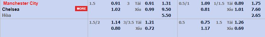 - Mức kèo nhà cái cược chấp trận này: Manchester City chấp 1,5 Trái. Manchester City ăn 0,91. Chelsea ăn 1,02