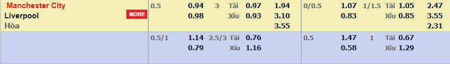 - Mức kèo nhà cái cược chấp trận này: Man City chấp 0,5 Trái. Man City ăn 0,94. Liverpool ăn 0,98