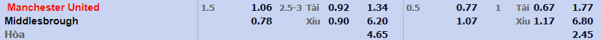 - Mức kèo nhà cái cược chấp trận này: Manchester Utd chấp 1,5 Trái. Manchester Utd ăn 1,06. Middlesbrough ăn 0,78