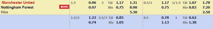 - Mức kèo nhà cái cược chấp trận này: Man Utd chấp 1,5 Trái. Man Utd ăn 0,96. Nottingham ăn 0,97