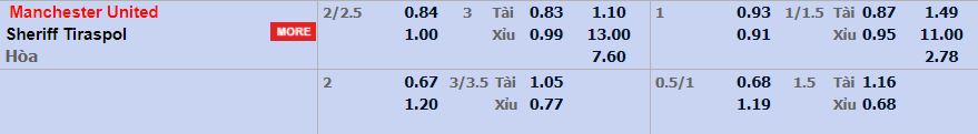 - Mức kèo nhà cái cược chấp trận này: Man Utd chấp 2,25 trái. Man Utd ăn 0,84. Sheriff ăn 1,00