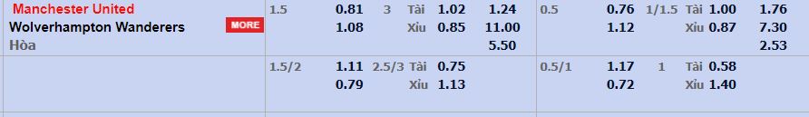 - Mức kèo nhà cái cược chấp trận này: Manchester Utd chấp 1,5 Trái. Manchester Utd ăn 0,81. Wolves ăn 1,08
