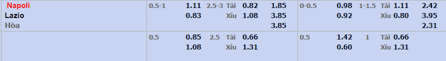 - Mức kèo nhà cái đưa ra trận này: Napoli chấp 0,75 Trái. Napoli ăn 1,11. Lazio ăn 0,83