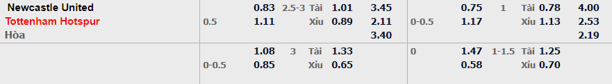 - Mức kèo nhà cái cược chấp trận này: Tottenham Hotspur chấp 0,5 Trái. Newcastle ăn 0,83. Tottenham Hotspur ăn 1,11