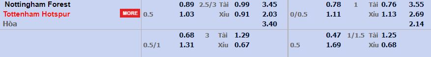 - Mức kèo nhà cái cược chấp trận này: Tottenham chấp 0,5 trái. Nottingham ăn 0,89. Tottenham ăn 1,03