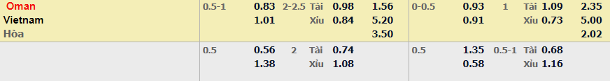 - Mức kèo nhà cái cược chấp trận này: Oman chấp 0,75 Trái. Oman ăn 0,83. Việt Nam ăn 1,01