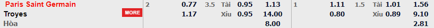 - Mức kèo nhà cái cược chấp trận này: Paris SG chấp 2 Trái. Paris SG ăn 0,77. Troyes ăn 1,17