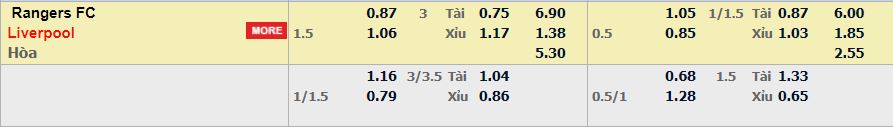- Mức kèo nhà cái cược chấp trận này: Liverpool chấp 1,5 trái. Rangers ăn 0,87. Liverpool ăn 1,06