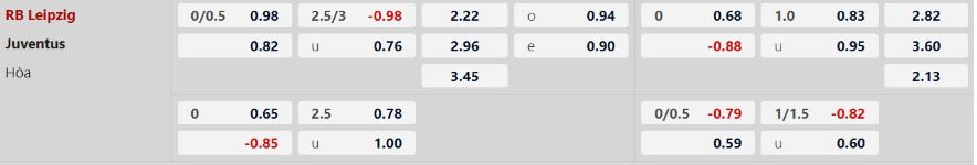 - Mức kèo nhà cái cược chấp trận này: Leipzig chấp 0,25 trái. Leipzig ăn 0,98. Juventus ăn 0,82