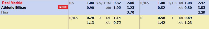 - Mức kèo nhà cái cược chấp trận này: Real Madrid chấp 0,5 trái. Real Madrid ăn 1,00. Ath Bilbao ăn 0,90