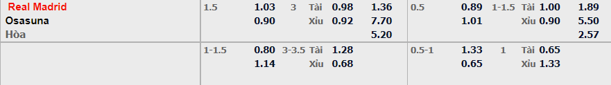 - Mức kèo nhà cái cược chấp trận này: Real Madrid chấp 1,5 Trái. Real Madrid ăn 1,03. Osasuna ăn 0,90