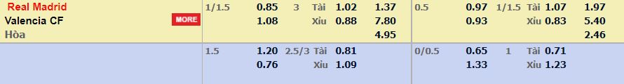 - Mức kèo nhà cái cược chấp trận này: Real Madrid chấp 1,25 Trái. Real Madrid ăn 0,85. Valencia ăn 1,08