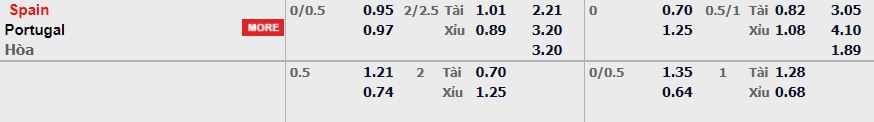 - Mức kèo nhà cái cược chấp trận này: Tây Ban Nha chấp 0,25 Trái. Tây Ban Nha ăn 0,95. Bồ Đào Nha ăn 0,97