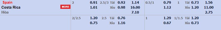 - Mức kèo nhà cái cược chấp trận này: Tây Ban Nha chấp 2 trái. Tây Ban Nha ăn 0,91. Costa Rica ăn 1,01