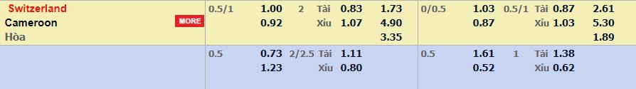 - Mức kèo nhà cái cược chấp trận này: Thụy Sĩ chấp 0,75 trái. Thụy Sĩ ăn 1,00. Cameroon ăn 0,92