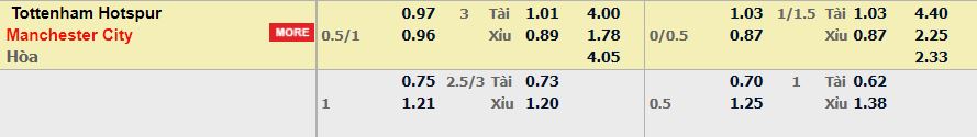 - Mức kèo nhà cái cược chấp trận này: Man City chấp 0,75 Trái. Tottenham ăn 0,97. Man City ăn 0,96