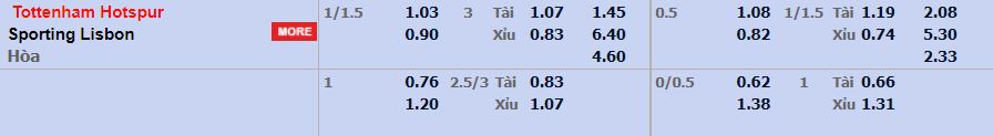 - Mức kèo nhà cái cược chấp trận này: Tottenham chấp 1,25 trái. Tottenham ăn 1,03. Sporting CP ăn 0,90