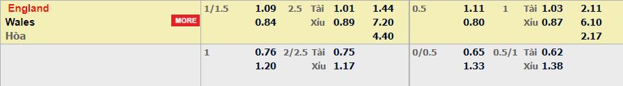 - Mức kèo nhà cái cược chấp trận này: Anh chấp 1,25 trái. Anh ăn 1,09. Wales ăn 0,84