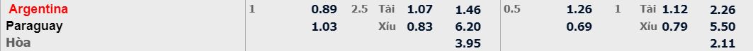 - Mức kèo nhà cái cược chấp trận này: Argentina chấp 1 trái. Argentina ăn 0,89. Paraguay ăn 1.03