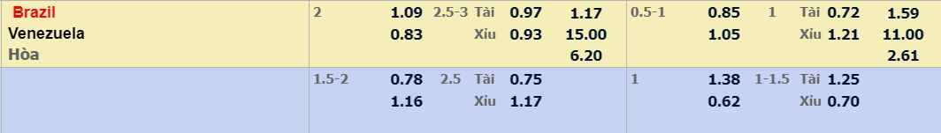 - Mức kèo nhà cái cược chấp trận này: Brazil chấp 2 Trái. Brazil ăn 1,09. Venezuela ăn 0,83