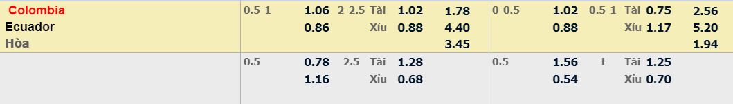 - Mức kèo nhà cái cược chấp trận này: Colombia chấp 0,75 Trái. Colombia ăn 1,06. Ecuador ăn 0,86