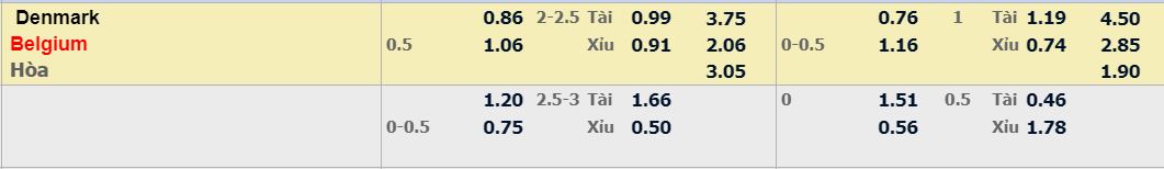 - Mức kèo nhà cái cược chấp trận này: Bỉ chấp 0,5 trái. Đan Mạch ăn 0,86. Bỉ ăn 1,06