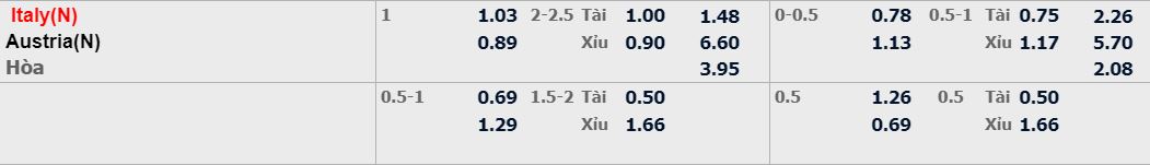 - Mức kèo nhà cái cược chấp trận này: Italy chấp 1 Trái. Italy ăn 1,03. Áo ăn 0,89